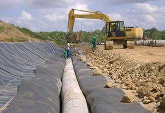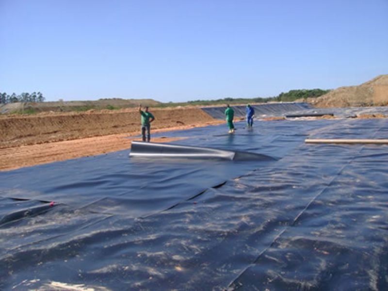 O solo é impermeabilizado com dupla camada de argila e geomembrana PEAD – Polietileno de Alta Densidade com 2mm de espessura, seguido de outra camada de argila para proteção mecânica.