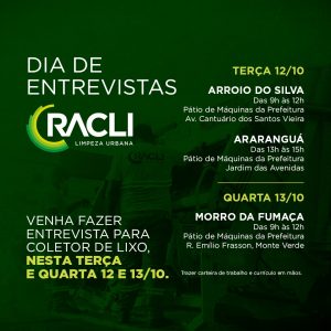 O Grupo RAC (formado pelas empresas RACLI Limpeza Urbana e RAC Saneamento) promove no dia 12 de outubro (feriado) em Arroio do Silva e Araranguá e no dia 13 de outubro, em Morro da Fumaça, um “Dia de Entrevistas” para selecionar candidatos para atuarem na coleta de lixo. A iniciativa tem como principal objetivo ir ao encontro dos profissionais que moram e que irão atuar nessas regiões, para facilitar o acesso ao processo seletivo das vagas no setor de coleta.