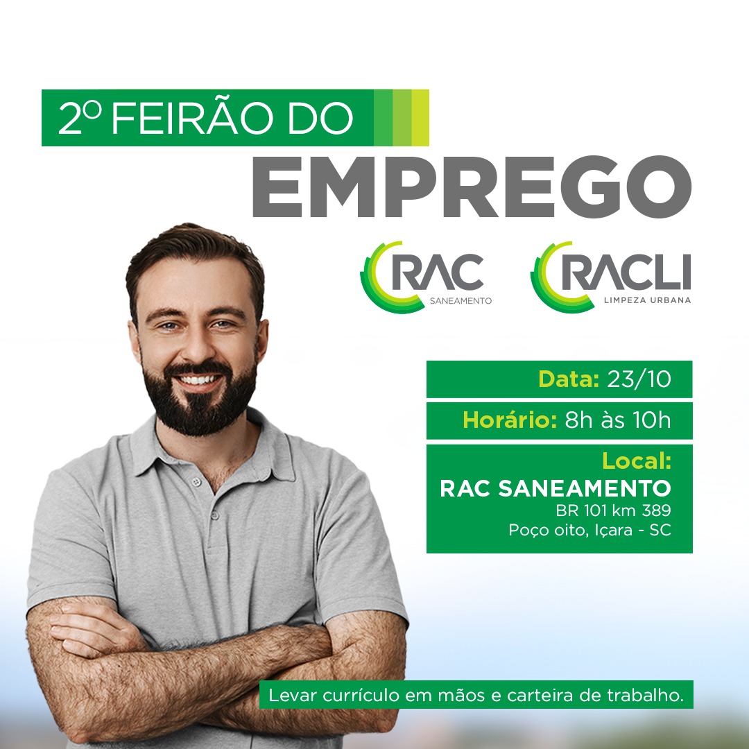 O Grupo RAC (formado pelas empresas RACLI Limpeza Urbana e RAC Saneamento) promove neste sábado a segunda edição do Feirão do Emprego. A iniciativa que será realizada no dia 23, das 8h às 10h, na RAC Saneamento localizada na BR-101, km 389, na comunidade de Poço Oito, em Içara, tem o principal objetivo de captar candidatos para as oportunidades oferecidas pelo grupo.