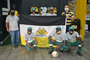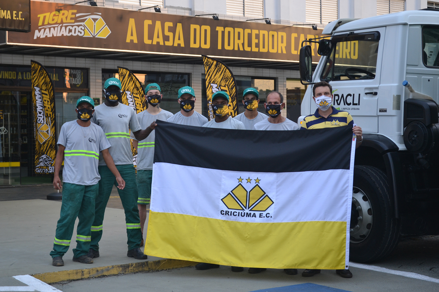 Os colaboradores do Grupo RAC (composto pelas empresas RAC Saneamento, RAC Saúde e Racli Limpeza Urbana) receberam na tarde desta quarta-feira, dia 29, 300 máscaras personalizadas da campanha “Cuidando de Quem Cuida da Gente” idealizada pelo Criciúma, em parceria com a Loja Tigre Maníacos.