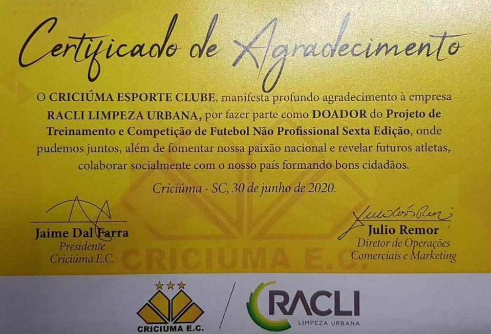A RACLI Limpeza Urbana, empresa que faz parte do Grupo RAC, juntamente com a RAC Saneamento e RAC Saúde, recebeu uma importante homenagem do Criciúma Esporte Clube por fazer parte do Projeto de Treinamento e Competição de Futebol Não Profissional Sexta Edição.